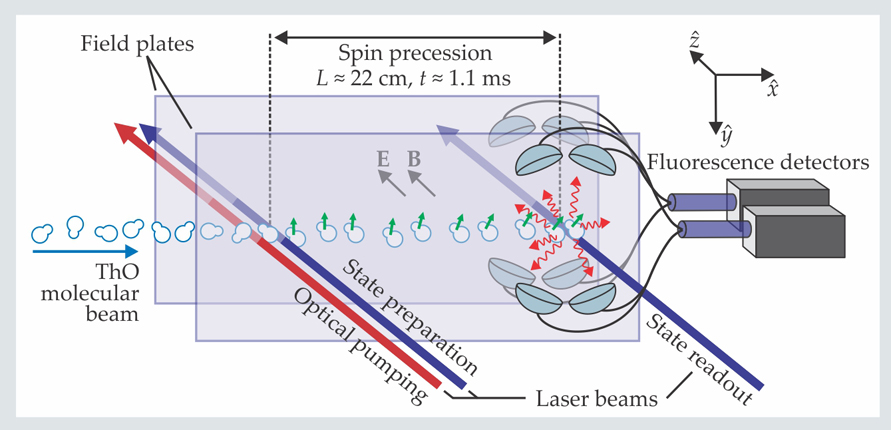 Figure 1 is a schematic of the ACME apparatus. A 50-Hz pulsed beam of ThO molecules embedded in cold neon carrier gas traces a pass through uniform magnetic and electric fields B and E pointing in the ẑ normal to the transparent electric-field plates. At the start and finish of the instrument’s 22-cm-long precession region, the molecules encounter laser beams that, respectively, initialize and read out their spin directions.
