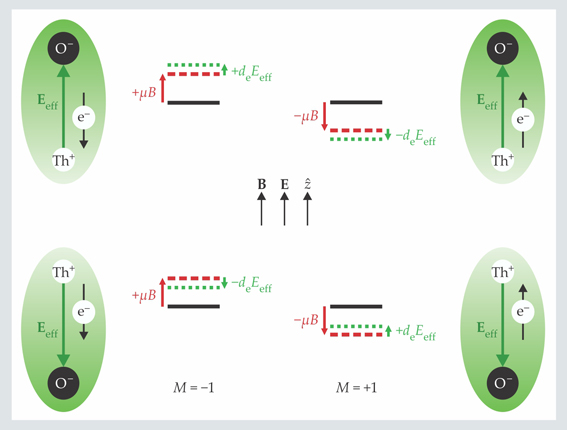 Figure 2. The greater the energy-level splitting between the M = +1 and −1 components of the polarized ThO molecule in the B and E fields of the ACME experiment, the faster is its spin-precession rate. The magnetic quantum number M determines the spin orientation of the valence electron e− in the B direction. Energy-level shifts are shown for the two opposite orientations of the strong intramolecular electric field Eeff experienced by that electron. The red arrows are the Zeeman shifts, with μ being the molecule’s magnetic moment. The green arrows indicate the shifts due to a de that’s parallel to the electron’s intrinsic spin. If it turns out to be antiparallel (de < 0), the green arrows are reversed.