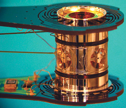 A hohlraum made from gold and 1 cm tall contains the fusion fuel capsule used in experiments at the National Ignition Facility. Light from the laser enters the ends of the cylinder and is converted to x rays, which implode the capsule.