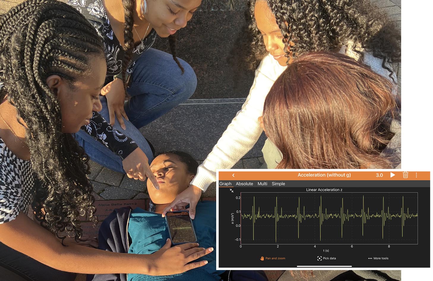 Smartphone accelerometers were sensitive enough to produce a seismocardiogram—a recording of the body vibrations produced by heartbeats—that detected Rakestraw’s previously undiagnosed mitral valve prolapse. The physicians treating him were taken aback by the accuracy of the reading, he says, which was confirmed with an electrocardiogram. The Physics with Phones heartbeat experiment was particularly exciting to students in Elissa Levy’s high school physics class at Thomas Jefferson High School for Science and Technology in northern Virginia; Levy says she has fallen “hook, line, and sinker” for Physics with Phones.