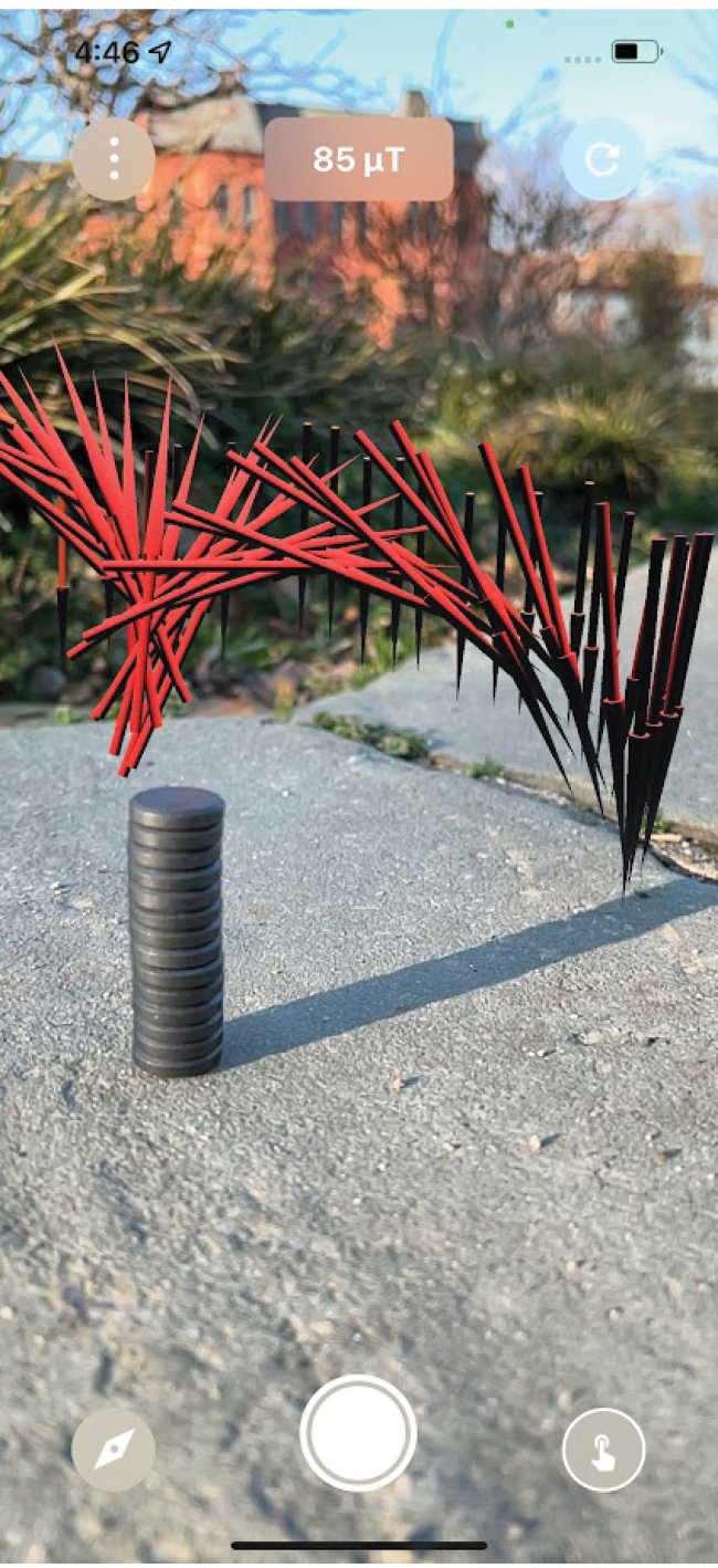 3D visualization of the magnetic field around a stack of ceramic magnets was produced by the Magna AR mode of Physics Toolbox. The app combines a smartphone’s magnetometer with an augmented-reality framework. Each vector represents both the relative magnetic field strength at the point of data collection as the phone was moved in an arc along the side of the stack, which acts as a bar magnet, and a portion of the full field around it. The vectors pointing away from the magnet indicate that the top is the north magnetic pole.