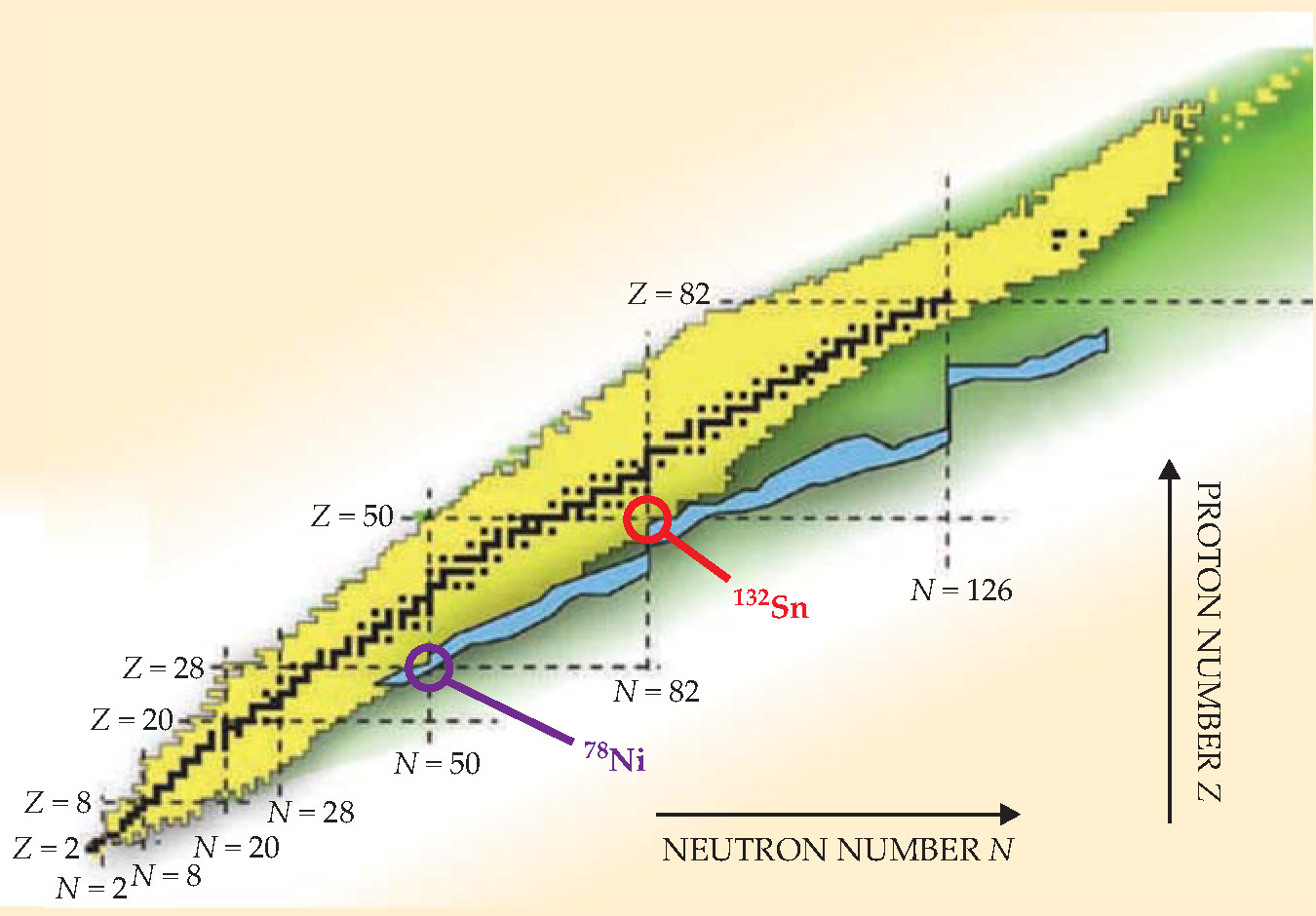 Figure 1. All known nuclides are shown black (if stable) or yellow (unstable). Dashed lines indicate magic numbers of protons and neutrons. Where they intersect, the nuclides are called doubly magic. Two of those, tin-132 and nickel-78, are adjacent to the r-process region (blue) of as-yet-unseen nuclides that are thought to be involved in the creation of the heaviest elements in supernovae.