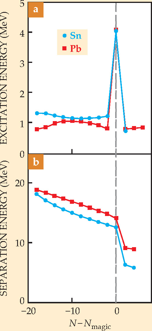 Figure 2. Doubly magic nuclides tin-132 and lead-208 clearly manifest special properties when compared, from archival data, with lighter isotopes that also have even neutron numbers N. (a) The energy of the first electric-quadrupole excitation peaks dramatically at N magic (82 for Sn, 126 for Pb). (b) The energy cost of removing a neutron pair falls abruptly after N magic.