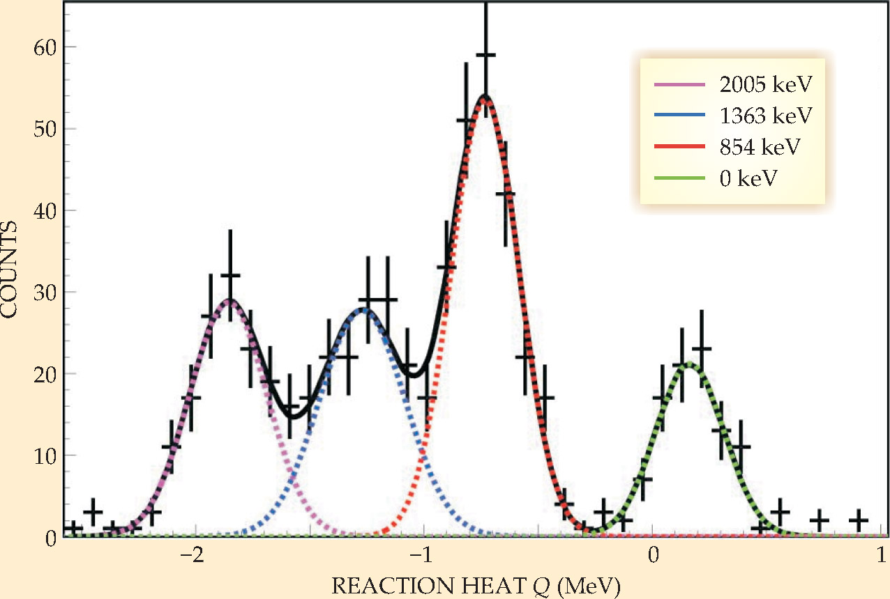 Figure 3. Distribution of Q , the reaction heat of the neutron-transfer reaction described in the text, measured at a fixed center-of-mass scattering angle θ in an experiment at Oak Ridge National Laboratory. The four peaks indicate the valence ground state and three excited states in which transferred neutrons land to form 133Sn nuclei. Fitted curves assume Gaussian error distributions, and yield the excitation energies (relative to the ground state) listed in the color key.