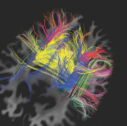 Van Wedeen, a radiologist and neuroscientist at Harvard University and the Martinos Center for Biomedical Imaging, wanted to see if he could map the wiring of the brain with MRI by tracking how water diffuses along signal-carrying fibers in white matter (see the image above). “As you increase the resolution, instead of becoming more complicated, the images get simpler and prettier. It turns out the fibers of the brain to a surprising extent form a [regular] three-dimensional grid. I am not referring to the small scale of axons. What we are seeing is the structure of large pathways from one area to another,” he says.