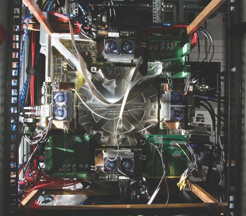 This neuromorphic computing system in Heidelberg mimics 200 000 neurons and 50 million synapses on a silicon wafer located behind the central octagonal aluminum plate. Field-programmable gate arrays configure the network and send and read input and output data.