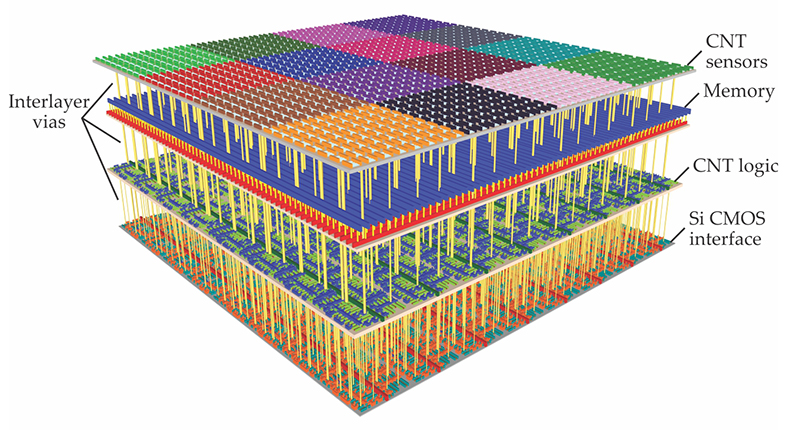 A three-dimensional integrated circuit, made possible with carbon nanotubes (CNTs). The circuit senses and classifies ambient gases using a multilayered stack of devices that are connected by platinum wires known as interlayer vias. In the top layer, roughly 1 million CNT field-effect transistors (FETs) register a change in electrical resistance when the gas molecules adsorb on a CNT. The second layer hosts memory cells that read and store the signals created by the FETs just above them. The third layer contains another million FETs that process the sensor data and implement a machine-learning algorithm to identify the type of gas picked up. Conventional silicon CMOS circuitry on the bottom acts as an interface to external devices. (Adapted from ref.