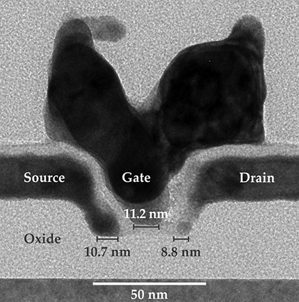 A record-small carbon nanotube field-effect transistor (CNT FET), imaged in cross section by transmission electron microscopy. The CNT channel (invisible in the micrograph) sits in a silicon dioxide trench under the gate and spans an 11.2 nm gap between source and drain electrodes. With a total active-region footprint of 40 nm, the FET occupies less than half the space needed for FETs made using any of the leading silicon technologies. (Adapted from ref.