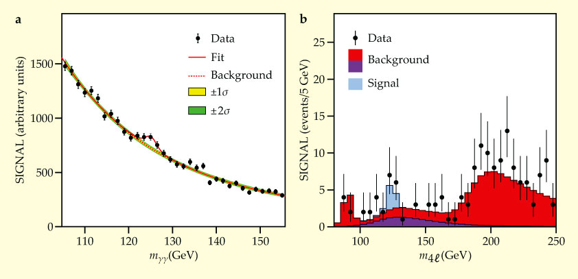 Figure 3. (a) The two-photon (γγ) mode as observed by the CMS team. The dotted red line is the expected background from non-Higgs processes, and the thin yellow and green stripes are the expected uncertainties of the background predictions. The bump at 125 GeV is attributed to Higgs decays. (Adapted from ref. 2) (b) The ATLAS team’s data for the four-lepton (4ℓ) mode. The peak attributed to the Higgs, again at 125 GeV, is shaded in light blue. (Adapted from ref. 3.)