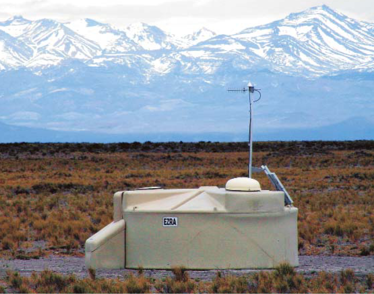 Figure 2. One of the Auger ground array’s 1600 water-Cherenkov detectors, with the Andes looming on the western horizon. Each detector holds 10 tons of water monitored by phototubes for Cherenkov light pulses. One can see the detector’s battery pack (left), its north-facing solar panel, and its electronics dome topped by a communications mast.
