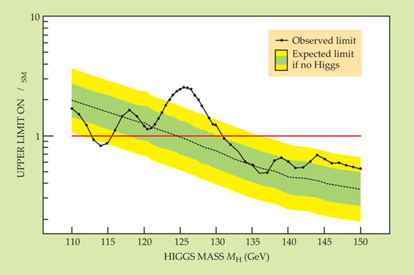 The figure’s green and yellow swath shows the SM expectation (two standard deviations wide) for what upper limits the experimenters could extract from the data sample if there were no Higgs in that mass region. One gets an idea of the statistical significance of the peak at 126 GeV by noting how far it rises above the swath. More LHC running will move the swath downward, raising a true Higgs peak farther above what a two-standard-deviation statistical fluke could mimic.