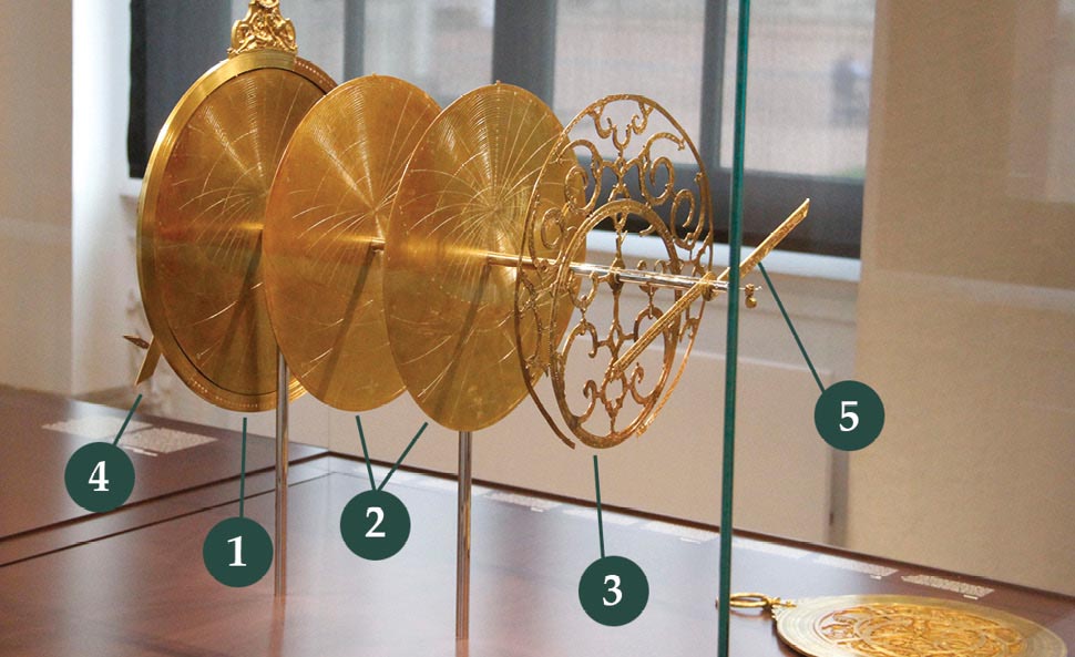 A mesh-like top called the rete, meaning net or web in Latin. It contains a ring that marks the ecliptic and multiple pointers that identify the location of specific stars in the night sky.