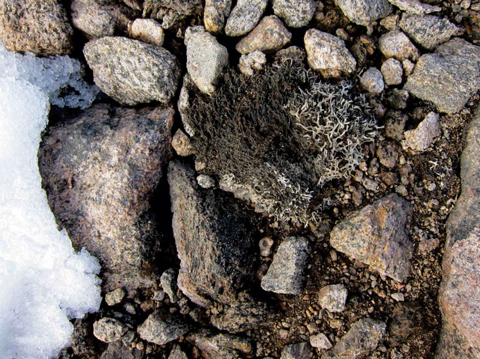 Figure 1. Long-dead but still rooted moss, just emerged from a receding local icecap on Canada’s Baffin Island. Carbon-14 dating of such clumps provides an impressively detailed chronology of the onset of the Little Ice Age around 1300 AD and its intensification around 1450.