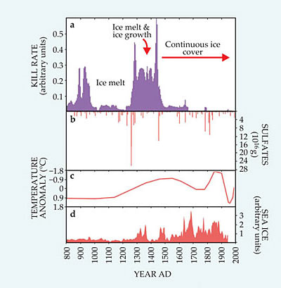 Figure 2. Geological data covering the last millennium. (a) Relative kill rates of moss by expanding local icecaps on Baffin Island, determined by carbon-14 dating. (b) Global mass of volcanic sulfate aerosol in the stratosphere, estimated from sulfates in ice cores. (c) Temperature anomalies in southern Greenland (relative to the 1880–1980 mean), determined from borehole measurements. (d) Concentration of ice-loving microplankton in sediment cores from the shelf off Iceland’s north coast, a proxy for sea-ice accumulation there. (Adapted from ref.