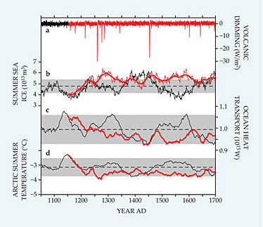 Figure 3. Model simulation results (red curves) for climate perturbed since 1150 AD by episodic volcanic dimming of sunlight. That simulation branches off a reference simulation (black) that ignores volcanic effects. Dashed black lines and gray bars show reference-simulation averages and standard deviations. (a) Ice-core sulfate data translated into mean global dimming of radiant solar heating by volcanic aerosols. (b) Total Northern Hemisphere sea-ice volume at the end of summer. The smoothed curves are 30-year running averages. (c) Mean northward heat transport across 26° N in the Atlantic Ocean. (d) Mean summer land-surface temperature north of 60° N between 90° W and 30° E. Comparisons with the reference model show the immediate and extended effects of the episodic volcanism. (Adapted from ref.