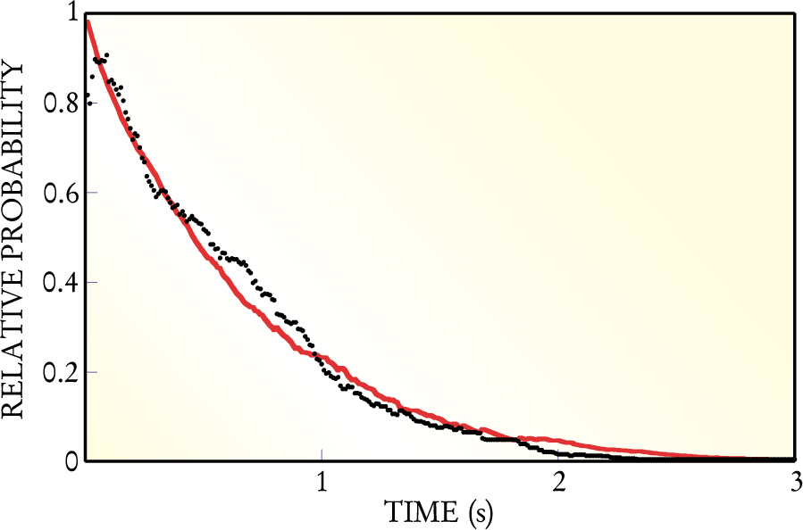 Integrated transient fluctuation theorem relates the relative probability of delivering negative versus positive work to an experimental vessel (black) to the average of exp(— W) over those trials delivering positive work (red). To within statistical error, the two curves are equivalent, as demanded by the theorem. The relative probability is nearly unity for short times, but it falls to zero over the 3-second period shown in the graph. Note, though, that even after 2 s, one occasionally sees negative work.