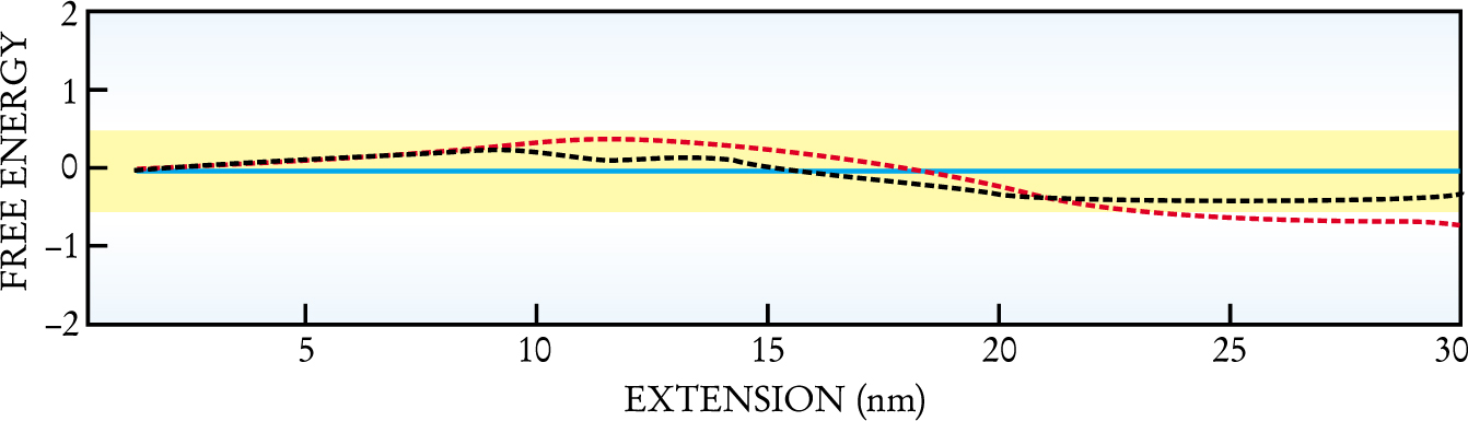 Free energy of a folded RNA molecule depends on the extent by which it is stretched. The graph shows theoretical free-energy estimates (divided by kT) given by the nonequilibrium work relation (dashed lines) after subtracting the measured value of the free energy determined from reversible unfolding. Two different rapid unfolding rates that lead to two different estimates are shown: 34 pN/s (black) and 52 pN/s (red). The reversibly determined free energy has an experimental error of ± 1/2, so the estimated values should lie in the yellow band centered about the blue baseline at an energy difference of zero. Systematic errors associated with instrument noise may be responsible for the underestimates at large extensions.