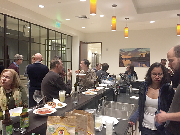 On a Friday evening in January, participants in a program on turbulence hang out in one of the new KITP residence’s bar areas.