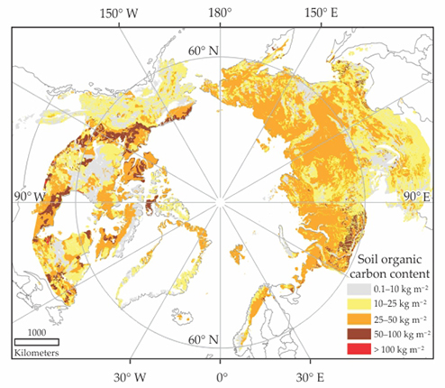 Soil organic carbon content to a depth of 1 m, as compiled in the Northern Circumpolar Soil Carbon Database. Organic carbon content and mercury content are correlated, so the carbon map can be used to estimate mercury content in the same regions. (Adapted from ref. 6, Hugelius et al., 2013.)