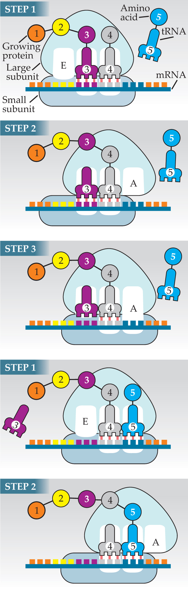 The large subunit has three sites for accommodating tRNA: A (for aminoacyl), P (for peptidyl), and E (for exit). Figure 1 depicts a ribosome as it’s about to add the fourth amino acid to a nascent protein. In step 1, a tRNA charged with an amino acid has found its way to the large subunit’s A site. The small subunit holds the codon corresponding to the fourth amino acid beneath the A-site tRNA. If, as is the case here, the tRNA’s anticodon complements the codon, the tRNA binds to the mRNA and remains in the A site. Next door in the P site sits the tRNA charged with the protein’s third amino acid.