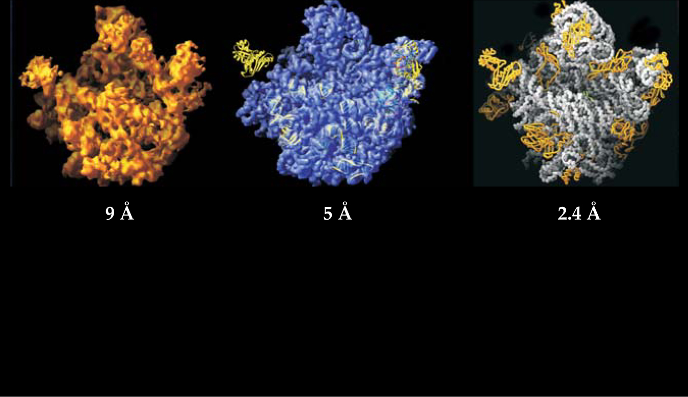 By the mid 1990s, when Steitz and Ramakrishnan joined Yonath’s ribosome quest, those technical hurdles had been surmounted. Figure 2 shows a sequence of structures determined by Steitz’s group, culminating with the 2.4-Å structure on the right. To reach that resolution, he and his group exploited not only the latest technology and techniques, but also structural information obtained from cryo-electron microscopy. Cryo-EM can’t yet yield true atomic resolution, but it can provide structural information without the need for crystallization. As a starting point for his 2.4-Å x-ray structure, Steitz and his colleague Peter Moore used a 20-Å cryo-EM structure derived by Joachim Frank of Columbia University.