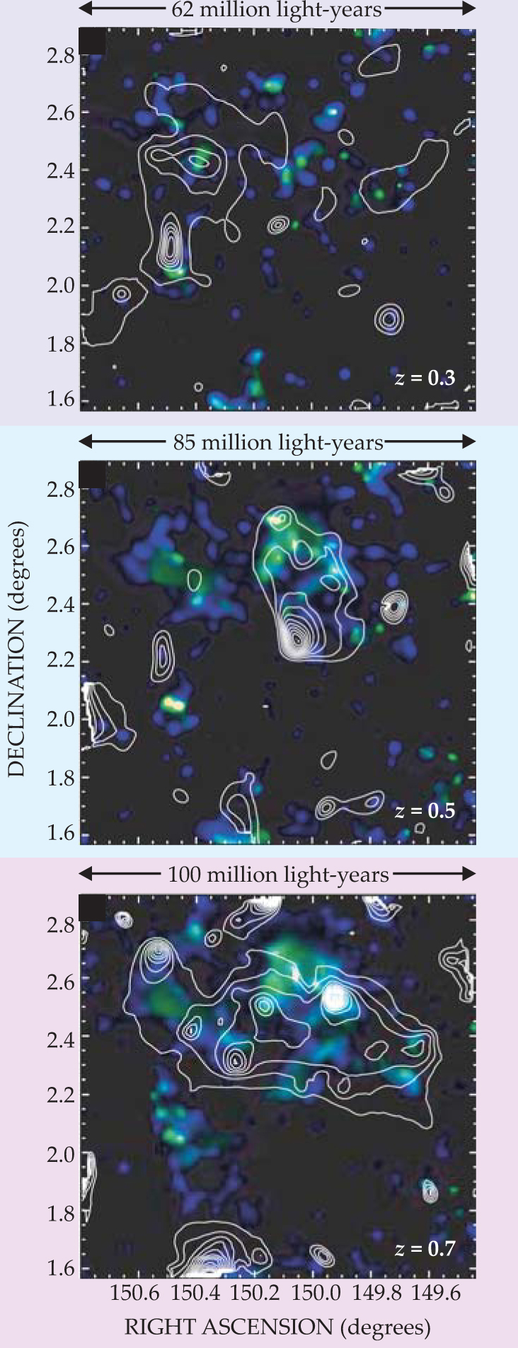 Figure 2 shows three such slices, at distances corresponding roughly to look-back times ranging from 3.5 to 6.5 billion years. The contour lines show the COSMOS field’s distribution of lensing matter (mostly dark) in each slice. As expected from the standard cold-dark-matter scenario—which assumes that the dark-matter particles are too cold to stream freely out of deep gravitational potential wells—the dark-matter distribution gets clumpier and more fragmented over time (with decreasing redshift) as gravitational clustering amplifies differences between regions of greater and lesser mass density. The same increasing fragmentation is also evident in Figure 1.