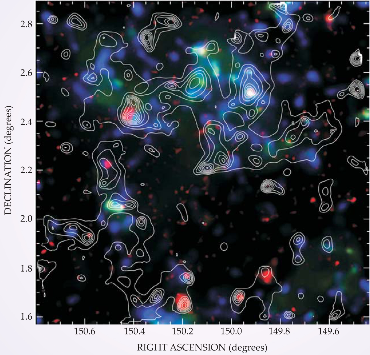 Such coincidence of dark-matter peaks and large galaxy clusters agrees well with the theoretical expectation that galaxies form most readily where gas has collected in deep potential wells created by the prior clustering of dark matter. Figure 3 demonstrates more broadly the affinity of ordinary baryonic matter for dense accumulations of dark matter. The figure’s contour lines show the projection onto the celestial sphere of all the COSMOS field’s lensing matter (roughly 85% nonbaryonic), summed over all z. Superimposed on the contours is not only the projected distribution of galaxies, but also all accumulations of hot intergalactic gas found in x rays by XMM-Newton . The projection makes it easier to see the filamentary character of the dark-matter distribution.