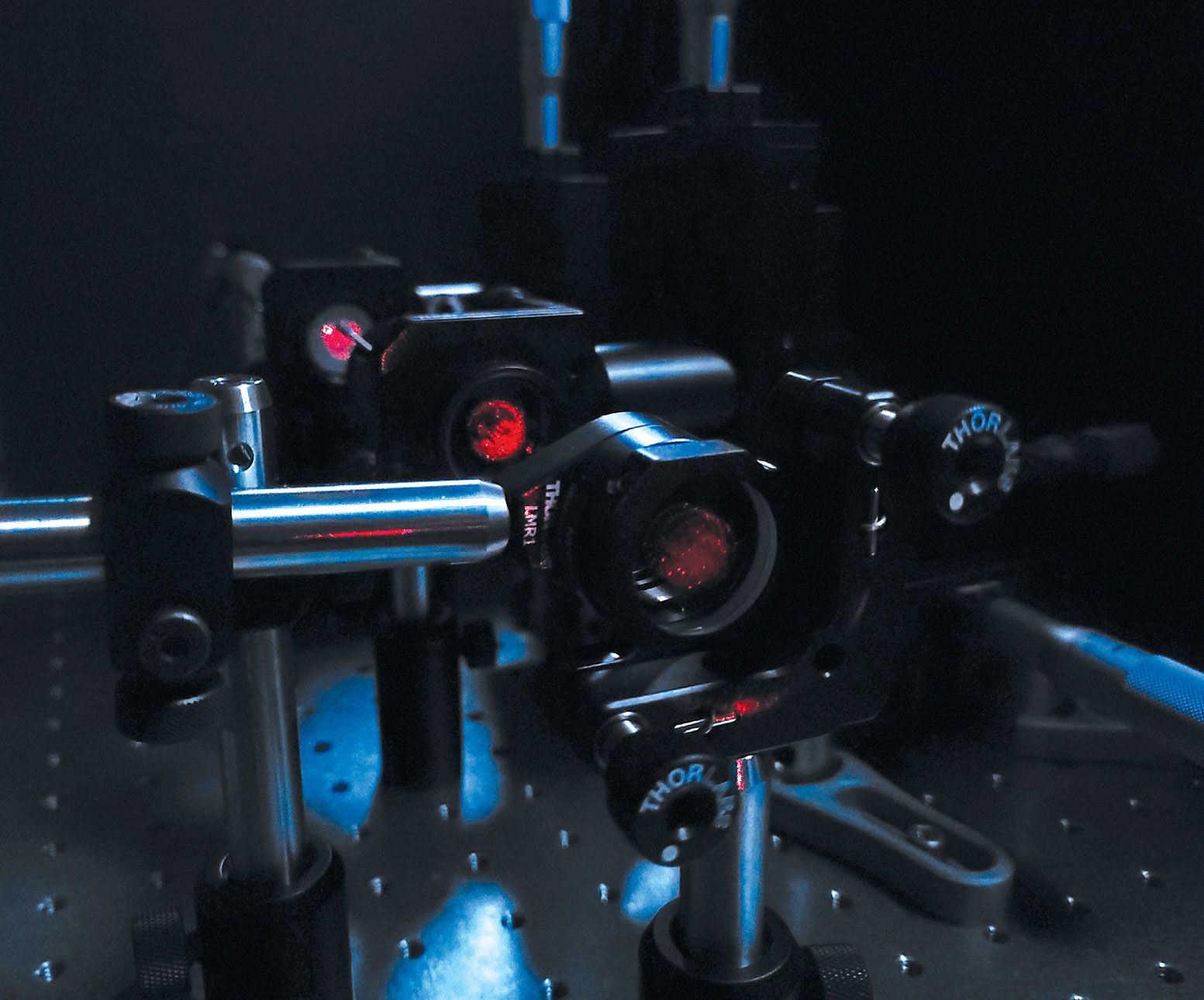 A speckle pattern (red) comprises over a thousand distinct optical modes. For the right combination of mirrors, mirror spacing, and absorption properties of an inserted pane of colored glass (mounted here horizontally in the foreground and obscured by the mirror in front of it), all the light modes will be nearly completely absorbed by the glass. (Courtesy of Omri Haim, the Hebrew University of Jerusalem.)