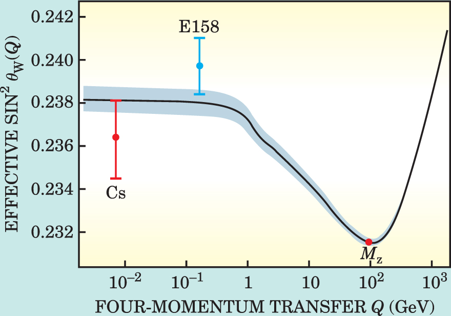 Figure 1. Running of the electroweak mixing parameter sin2 θW as a function of Q, the magnitude of the four-momentum transfer between interacting particles. The mixing parameter is inversely proportional to gW2, the square of the weak coupling constant. The curve showing the standard-model prediction is anchored at MZ, the mass of the Z0 boson, where the mixing parameter has been precisely determined. Lying 6 standard deviations higher, the new SLAC E158 point demonstrates the running of the mixing parameter. The point at still lower Q, from a 1999 measurement of parity violation in cesium atoms, is consistent with both the predicted running and no running at all.