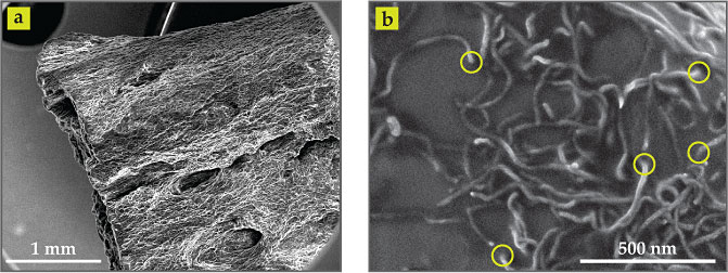 Figure 1. (a) Cyberwood is the term coined to describe the dehydrated result of growing a culture of tobacco cells in the presence of carbon nanotubes. (b) As the cells grow in a nutrient-filled flask, the thread-like nanotubes partially penetrate (inside the yellow circles) the gelatinous cell and self-assemble into a dense network of intracellular connections. The network lends the composite mechanical strength and electrical conductivity. (Adapted from ref.