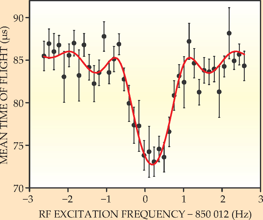 Any ion that made it to the precision trap was then subjected to a narrowband RF excitation pulse before leaving the trap and having its velocity gain measured. The trapped ion experienced resonant acceleration only if the imposed ν RF was very close to its ν C. Figure 2 shows the result of one four-hour cyclotron-resonance measurement for 253No. As the ν RF passes through ν C, the ion’s flight time to a downstream detector manifests the resonant excitation.