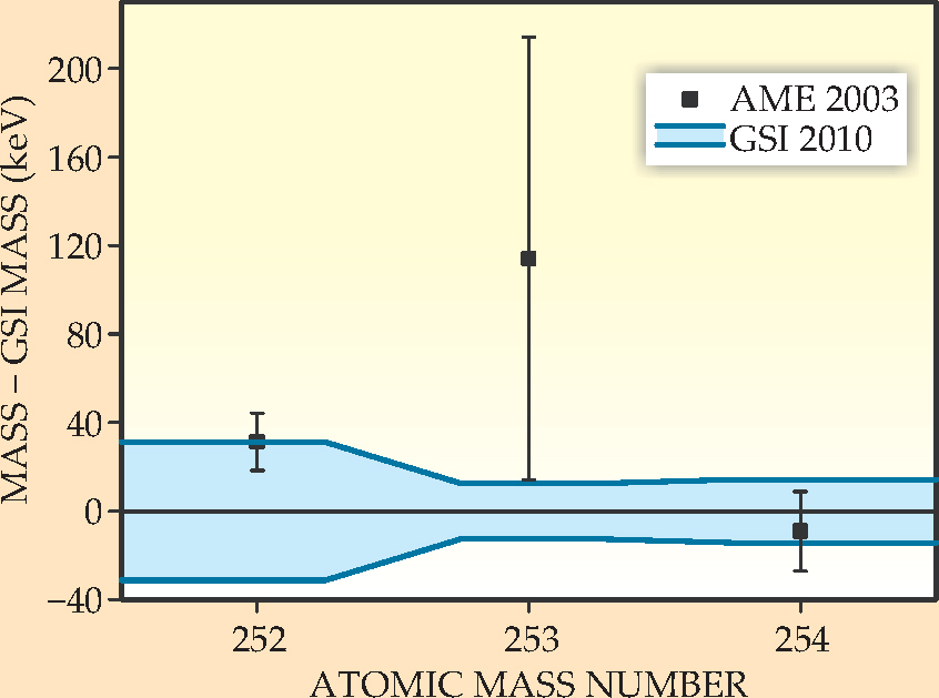 Figure 3. Comparing the Penning-trap mass measurements of three nobelium isotopes at the GSI Helmholtz Center for Heavy Ion Research with the masses determined from α-decay chains and listed in the 2003 Atomic Mass Evaluation compendium. The GSI measurements and their one-standard-deviation uncertainties are represented by the horizontal axis and its enveloping blue swath.