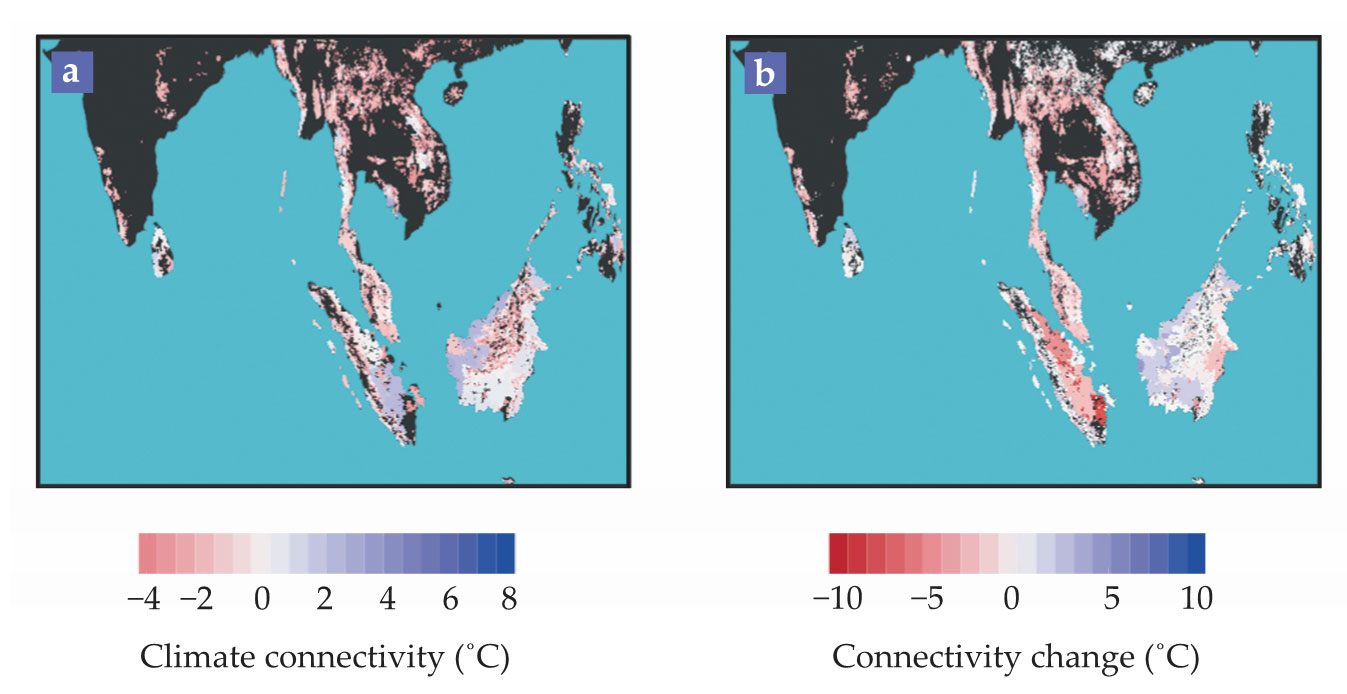 Climate connectivity, shown here (a) for the Asian tropics for the year 2012, is defined as a region’s current average annual temperature minus the projected future temperature of the coolest destination to which it’s connected. Positive connectivity, shown in blue, means that species stand a good chance of coping with climate change by moving; negative connectivity, shown in red, means they don’t. (b) Changes in land use between 2000 and 2012 have changed the climate connectivity in many regions. Most, but not all, of those changes are for the worse. (Adapted from ref.