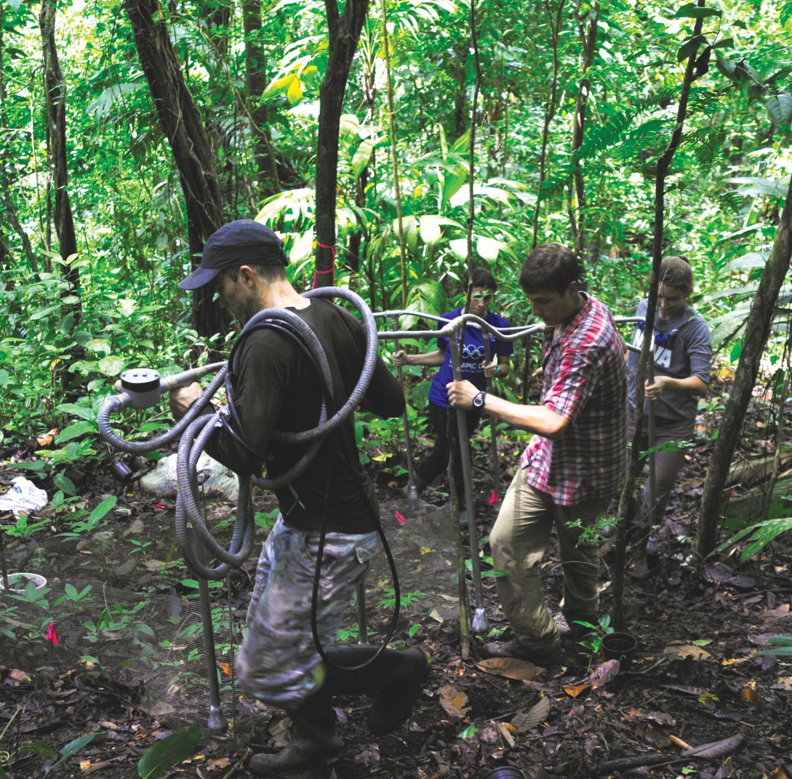 On Barro Colorado Island, in Gatun Lake in the middle of the Panama Canal, Andrew Nottingham and his colleagues hike through the forest with a handmade device for heating the soil. It and other instruments were buried in the ground and used to heat more than 120 cubic meters of soil by 4 °C as part of a two-year experiment to measure CO2 released from soil in a warming climate. (Photo by Geetha Iyer.)