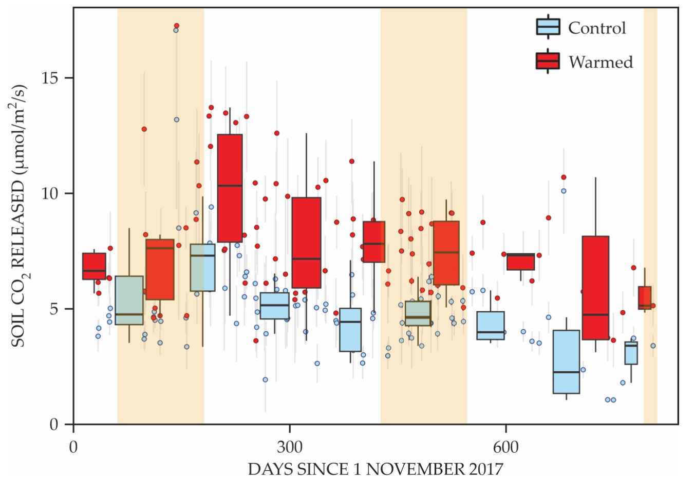 For two years, instruments placed in weatherproof boxes recorded the CO2 output over the warmed plots and nearby ambient-temperature control plots. The researchers found that the CO2 release rate increased substantially, shown in figure