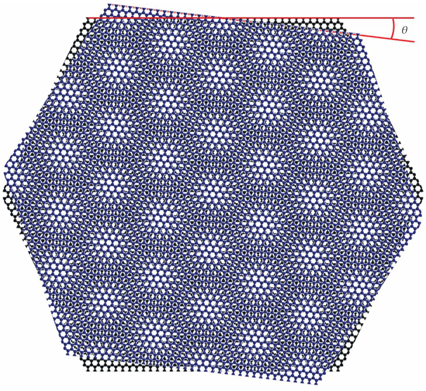 The moiré lattice from two layers of graphene (blue and black hexagonal patterns) is the larger quasiperiodic hexagonal pattern formed by regions where the graphene lattices nearly align. The relative angle θ between the layers determines the periodicity of the moiré lattice. (Courtesy of ICFO/ Xiaobo Lu.)