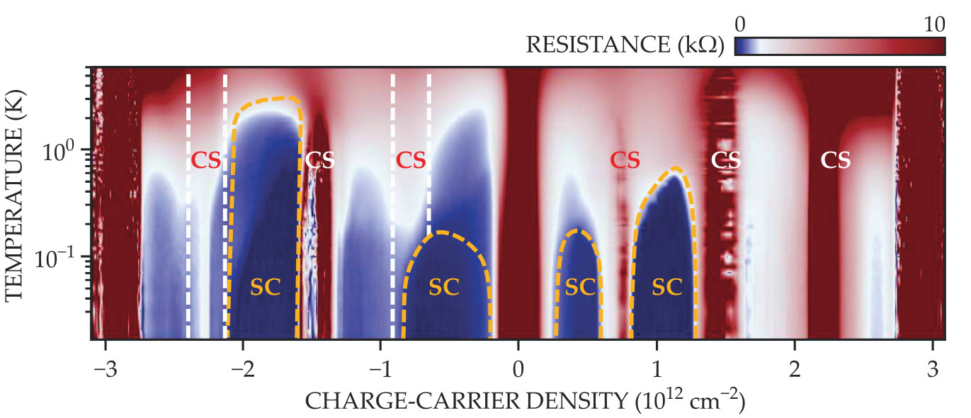 In this electrical phase diagram of magic-angle graphene, the orange dashed lines indicate the 50% resistance value of the phase transition to a superconductor (SC) with the highest transition temperature of 3 K. Between the SC states, the magic-angle graphene is in a correlated state (CS). (Courtesy of ICFO/Xiaobo Lu.)