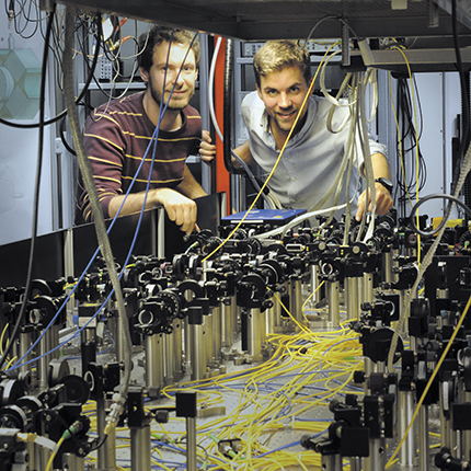 Cavity QED at the Max Planck Institute of Quantum Optics. Nicolas Tolazzi (left) and Christoph Hamsen peer over a table packed with mirrors, lenses, and fiber-optic cables (yellow) that route several laser beams to an adjacent table (not shown), where the optical cavity and a trapped rubidium atom reside in a vacuum chamber. On the left side are several acousto-optic modulators fed by a high-power laser diode (blue box). Hamsen points to a λ/2 plate that rotates the polarization of the beams into specific, well-defined states. (Photo courtesy of Nicolas Tolazzi.)