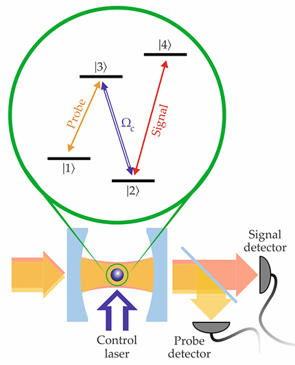 In the team’s setup, two cavity modes, at 795 nm and 780 nm, are pumped using weak laser beams called the probe and the signal. The separate beams drive electronic transitions in Rb between states |1⟩ and |3⟩ and between |2⟩ and |4⟩, as depicted in figure 2. To couple the photons, the researchers added a control laser beam with strength Ωc to drive the |2⟩ to |3⟩ transition. The additional field connects the ground states |1⟩ and |2⟩ via the excited state |3⟩.