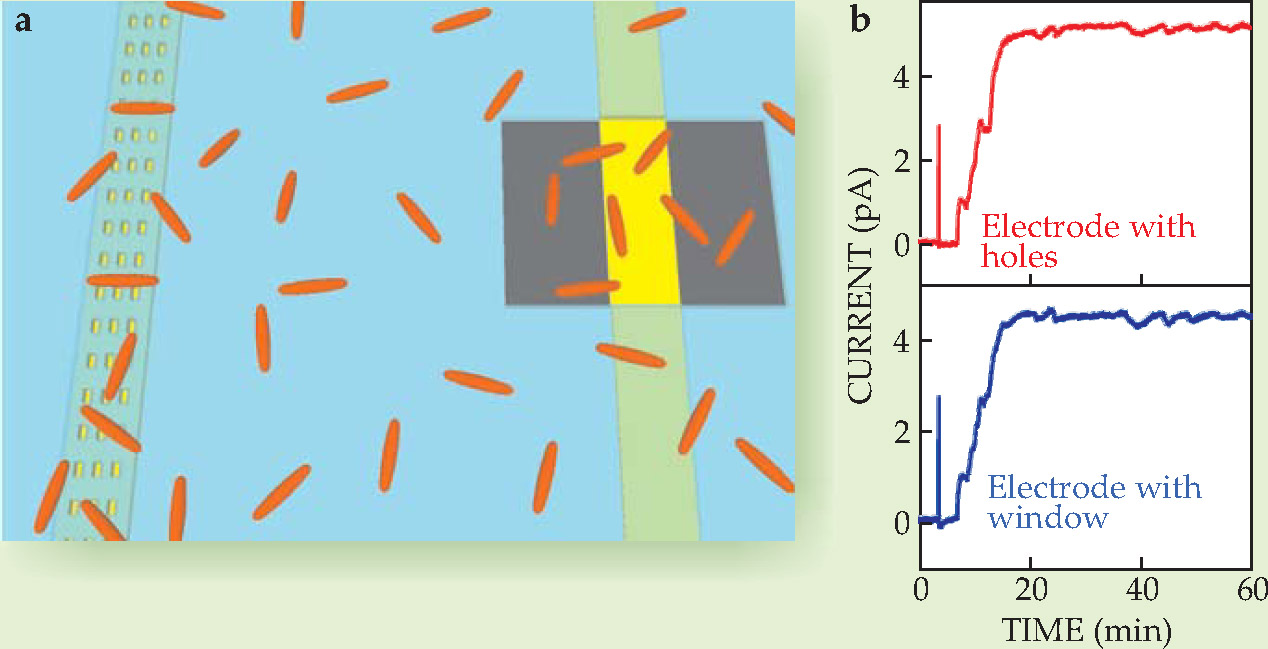 Lieber and Ringeisen set out to investigate Shewanella’s electron transfer with a miniature fuel-cell experiment. 1 They fashioned an array of gold-titanium composite nanoelectrodes on a glass chip, to which a microbial culture would be exposed. The researchers’ trick, then, was to carefully control how microbes accessed the nanoelectrodes. To that end, they covered the nanoelectrode array with a 400-nm-thick layer of insulating silicon nitride. They then etched through the insulating layer to expose alternating electrodes with either a grid of holes, each just a few hundred nanometers across, or a single window of 6 × 10 µm, as depicted in figure 1. The total exposed area was the same for both types of electrodes, but whereas the windowed electrodes would allow free access to several microbes at a time, the nanoholes would preclude any direct contact between the electrode and the cell membrane.