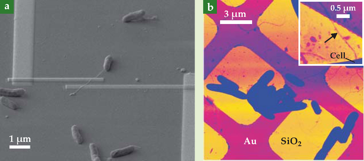 In theory, however, much of the measured resistance could have come from, say, the nanowire-platinum interfaces and not the nanowire itself; the two-electrode design affords no way to distinguish between the two. Thus, to crosscheck their result, the researchers deposited Shewanella microbes on a meshed grid of gold and silicon dioxide, as shown in figure