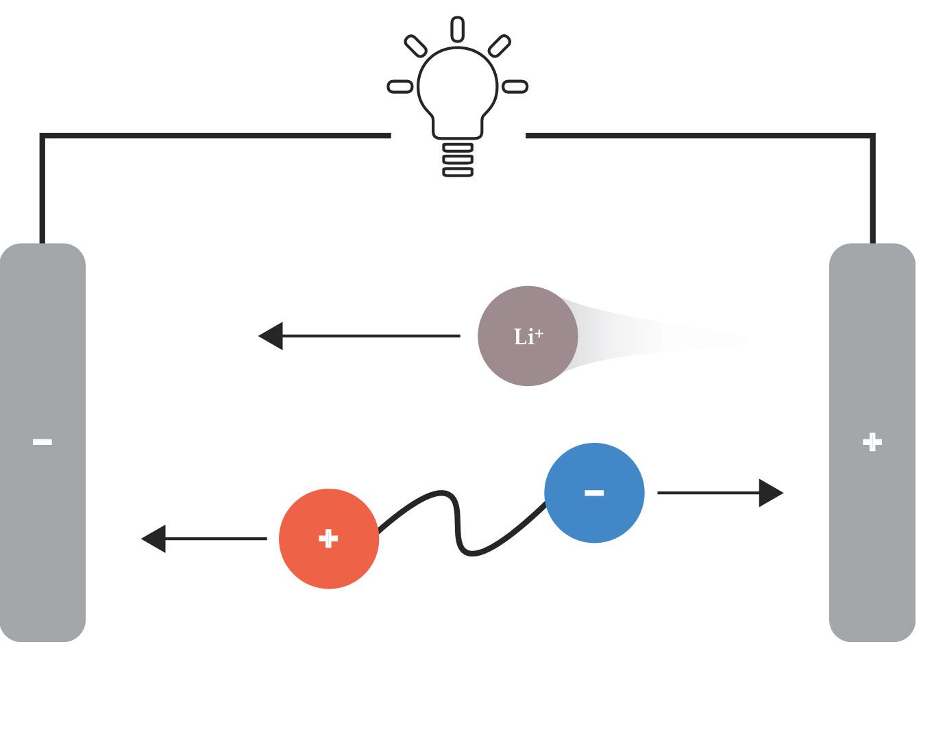 Inside a battery, working ions, such as lithium, flow between the electrodes to counter the flow of electrons in the external circuit. If the battery electrolyte contains other charged species, they, too, can move under the battery’s electric field, compete with the flow of working ions, and compromise performance. But when the electrolyte’s positive and negative charges are tethered together in a single molecule, called a zwitterion, the electric forces cancel and the electrolyte molecules stay in place. (Courtesy of Jenny Pringle, adapted by Freddie Pagani.)