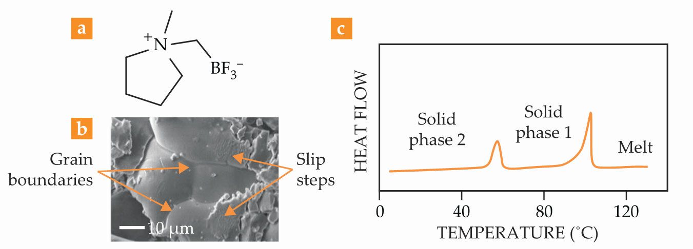 The room-temperature micrograph of the zwitterionic material seen in figure 2b already shows promising signs of disorder, with small, irregular grains full of defects. And the calorimetry trace in figure 2c shows the telltale sign of a plastic crystal: a clear transition between two solid phases, tens of degrees below the melting transition.