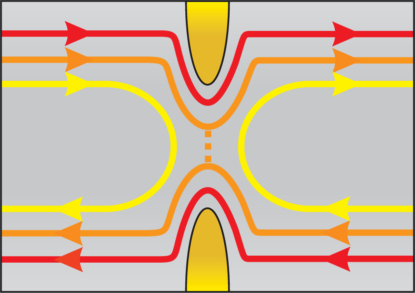 Figure 1. Conduction in the quantum Hall state takes place in counter-propagating edge states. Charging the electrodes of the quantum point contact (gold) pushes the edges together and spreads the current among more than one edge state. At a certain voltage, charge carriers in the lowest-lying edge state are too far apart to tunnel (red), while charge carriers in the highest-lying edge state are completely reflected (yellow). Tunneling occurs in the intermediate edge state (orange).