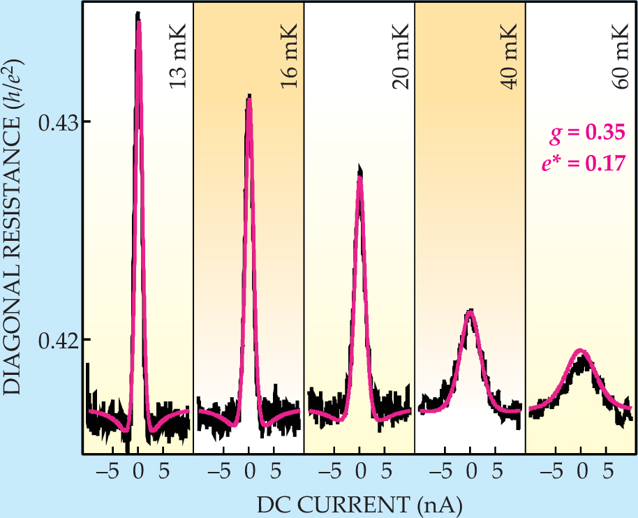 Figure 3. Tunneling between edge states varies with temperature (black). The dependence, as fitted here with a model devised by MIT’s Xiao-Gang Wen (pink), allowed the team from Harvard University and MIT to extract the quasiparticle charge