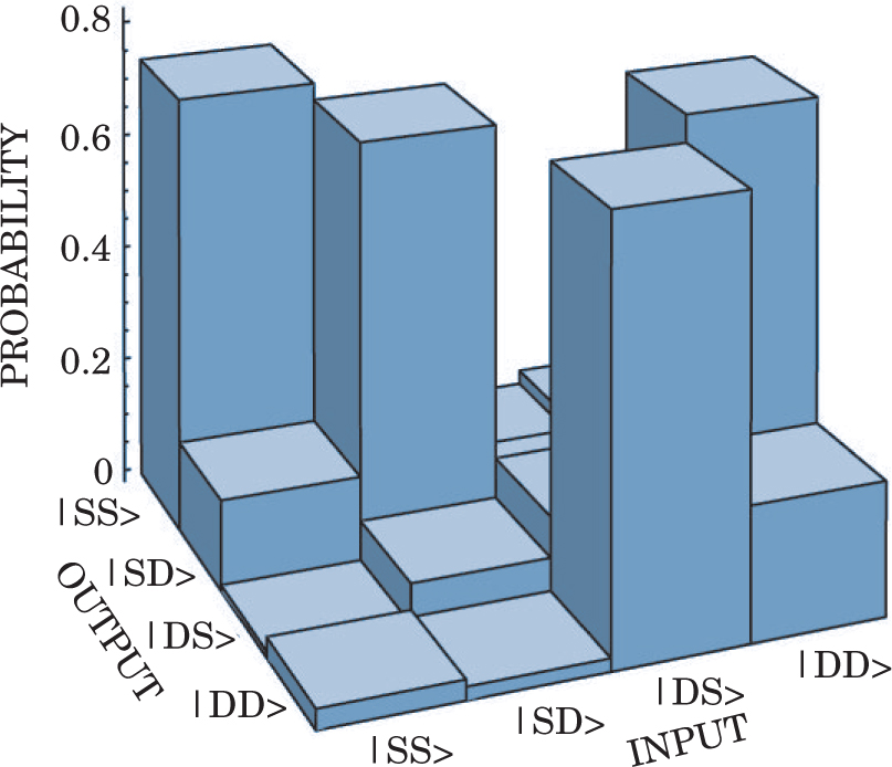 Figure 1. Experimental truth table for the controlled-NOT gate demonstrated at the University of Innsbruck. The probability for two 40Ca+ ions to be in a particular final state is plotted as a function of the possible initial states. In the kets denoting each state, each letter is an S or D depending on whether the corresponding ion is in an S1/2 ground state or the metastable D5/2 state. Thus, for example, |SD〉 indicates that ion 1 is in the S state and ion 2 is in the D state. The CNOT gate flips the state of the second ion only if the first ion is in state D. For an ideal gate, the probabilities would be either 100% or 0.
