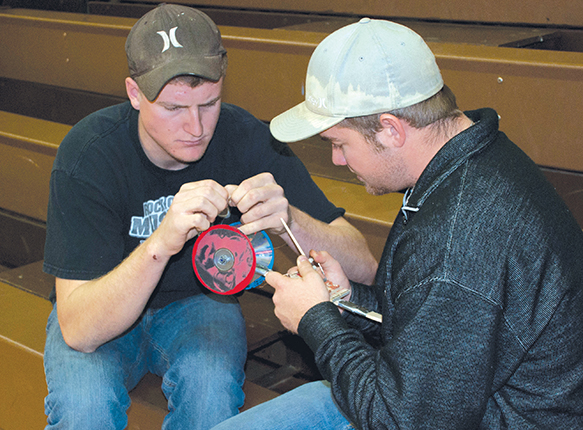 Students Adjust the Mousetrap-Powered Car they designed and built in an applied physics class at Cloud County Community College in Kansas.