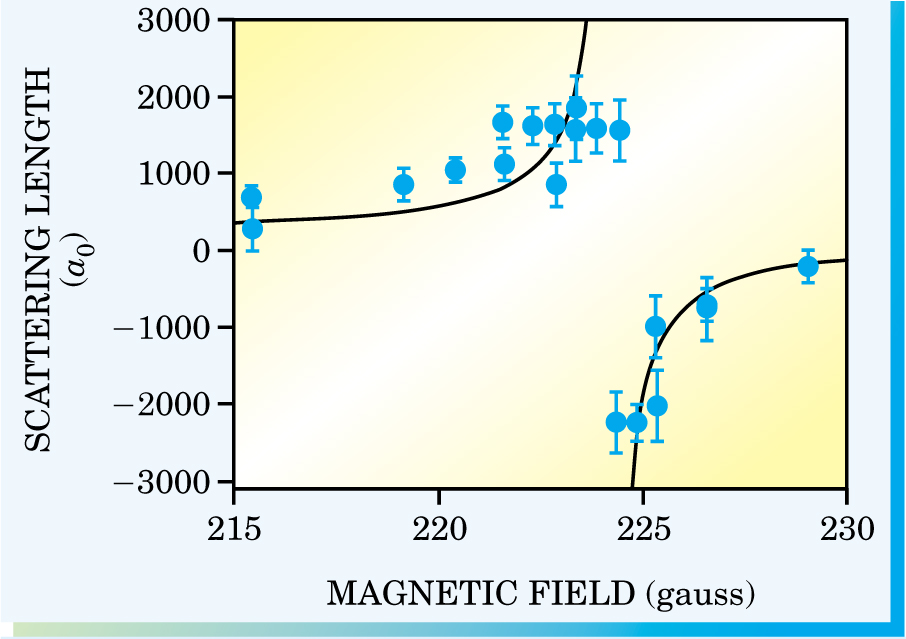 Figure 1. A Feshbach resonance (solid curve), seen here near 224 gauss, is signaled by the divergence of the scattering length a in units of the Bohr radius, a0. The curve is predicted by the theory of dilute gases. When a is smaller than the distance between atoms, one can write the mean-field energy as na, where n is the atom density. For larger a, the energy should approach a constant. The data points are values of a inferred from measurements of the mean-field energy in a degenerate Fermi gas of potassium-40 atoms. The points closest to resonance show a deviation from the theoretical curve.
