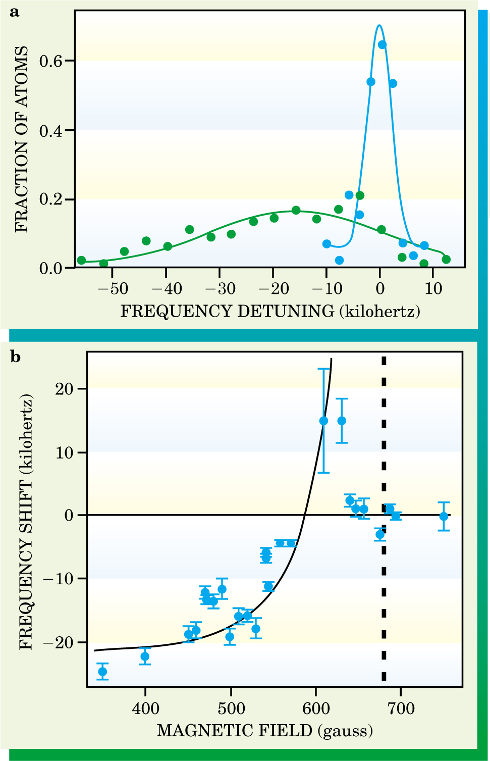 Figure 2. Shift in radio-frequency resonance between spin states within a degenerate Fermi gas of lithium-6 atoms. (a) The radio-frequency transition between two spin states is higher and narrower when a third spin state is absent (blue dots) than when the third state is present (green dots). The frequency shift is a measure of the shift in mean-field energy caused by the third atom. (b) Measured frequency shifts (blue dots) are much smaller near a Feshbach resonance (dashed line) than predicted by the theory of dilute atomic gases (black curve).