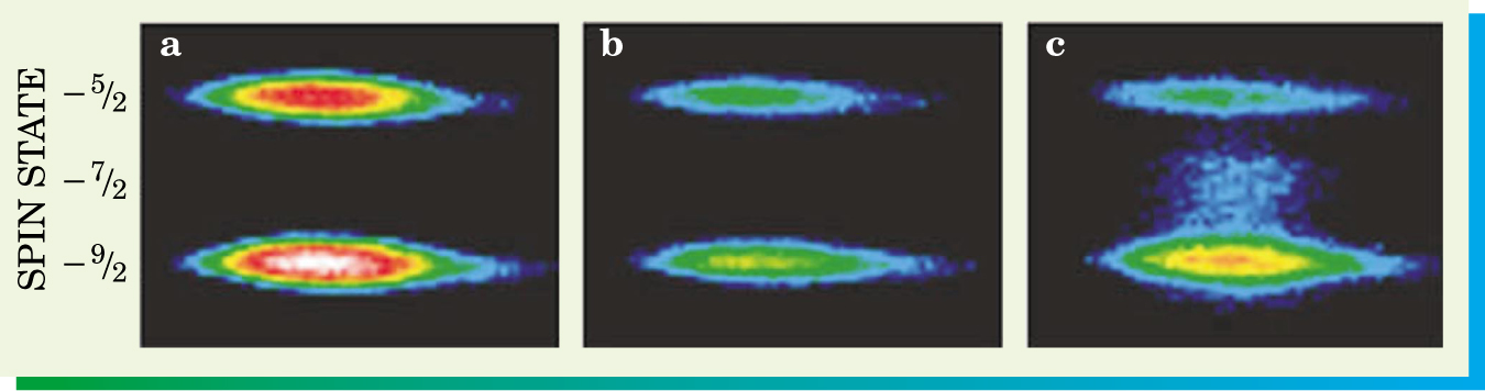 Figure 3. Proof of molecule formation is established by looking at changes in the number of ultracold potassium-40 atoms in each of three spin states. (a) At first, all atoms are in one of two spin states: mf=−5/2 or mf=−9/2. (b) After a magnetic field is ramped through a Feshbach resonance, atoms disappear from the two initial states because they are bound into molecules. (c) Following a radio-frequency pulse, some atoms from the dissociation of the molecules appear in the mf=−7/2 state and some return to the mf=−9/2 state.